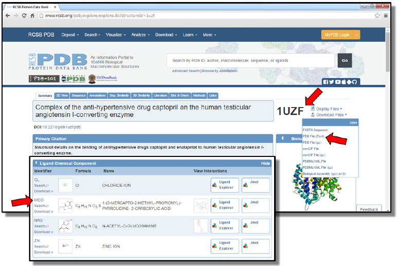 Figura 3. Página principal do co-cristal captopril-ECA (código PDB: 1UZF). As setas indicam o código PDB, o arquivo texto das coordenadas cartesianas do complexo e a identificação do ligante captopril, respectivamente19