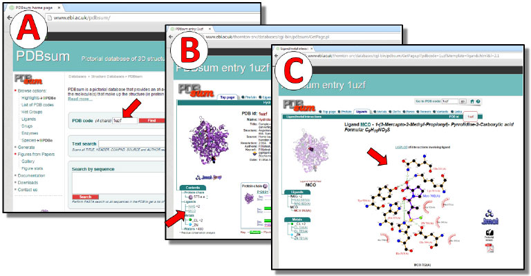 Figura 4. Análise dos complexos no PDBsum. (A) página inicial. (B) página contendo os dados do complexo captopril-ECA (código PDB: 1UZF). (C) diagrama LIGPLOT gerado para o complexo captopril-ECA. As setas vermelhas indicam, respectivamente, o local para inserçao do código PDB e o subcódigo do fármaco captopril (MCO) que, ao ser selecionado, gera o diagrama representativo da interaçao22-24