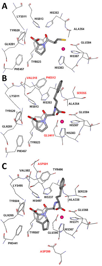 ![]() Figura 5. Em bastão as estruturas do captopril (A), enalaprilato (B) e ramiprilato (C), com seus respectivos aminoácidos do bolsão catalítico (representados em linhas), após o tratamento das estruturas cristalográficas. Em magenta está representado o íon Zn2+. Em preto os aminoácidos do bolsão. Em vermelho os aminoácidos que se diferenciam nas interações com cada fármaco
