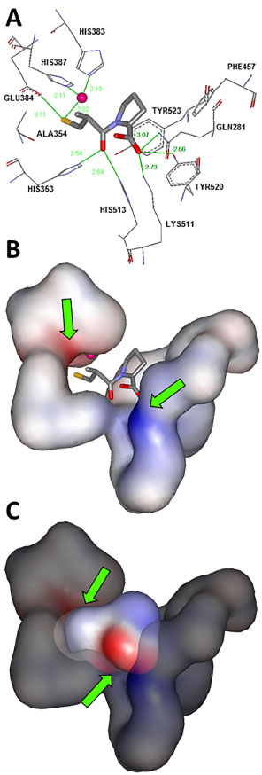 ![]() Figura 6. (A) Distâncias interatômicas em Å das regiões de interação do captopril com a ECA. (B) As setas indicam as regiões com elevada densidade eletrônica (em vermelho) e com baixa densidade eletrônica (em azul) da ECA. (C) As setas indicam a complementariedade eletrônica existente entre o captopril e o bolsão catalítico da ECA. Em magenta está representado o íon Zn2+