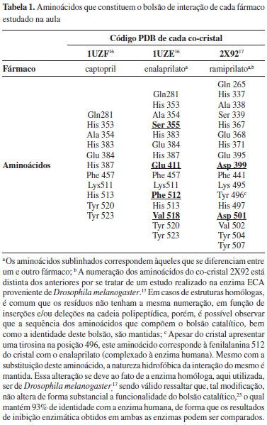 | Interações fármaco-receptor: aplicações de técnicas computacionais em aula prática sobre a evolução dos inibidores da enzima conversora de angiotensina Drug-receptor interactions: in silico approaches applied to experimental classes regarding the evolution of angiotensin converting enzyme inhibitors |