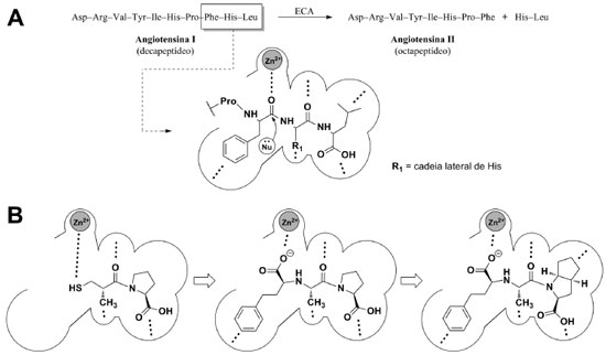 O mecanismo de ação associado a esta classe de fármacos reside na habilidade destas moléculas em se ligar ao sítio catalítico da enzima, impedindo, assim, a conversão de angiotensina I em angiotensina II.12 A enzima conversora de angiotensina (ECA) é uma metaloproteinase responsável por hidrolisar a angiotensina I (um decapeptídeo inativo), convertendo-a em angiotensina II (um octapeptídeo ativo) (Figura 2), gerando como principais respostas fisiológicas o aumento da resistência vascular periférica, a secreção renal de aldosterona e a redução dos níveis séricos de bradicinina, que culminam no aumento da pressão arterial do indivíduo.13 A atividade catalítica da ECA é dependente de zinco II (Zn2+) e as bases químicas necessárias ao reconhecimento molecular de seu substrato estão associadas a uma sequência tripeptídica específica presente na angiotensina I. Esta sequência tripeptídica é capaz de realizar coordenação com o íon Zn2+ e sofrer um ataque nucleofílico, que resulta na clivagem do substrato decapeptídico (Figura 2A).14
