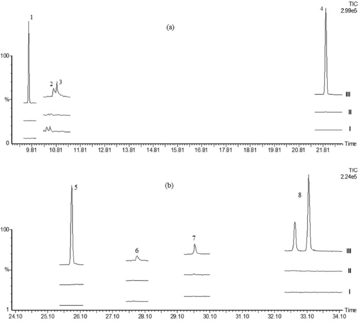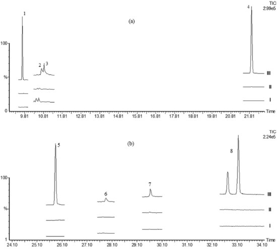 Figure 1. Chromatograms of uncultivated soil (I), organic farming soil (II) and organic farming soil spiked (III) with 0.8 mg kg-1 of a multi-standard solution of pesticide. Figure (a): trifluralin (1), dimethoate (2), simazine (3) and 4,4'-DDE (4); Figure (b): 4,4'-DDT (5), iprodione (6), azinphos-methyl (7) and permethrin mixture cis-trans (8)