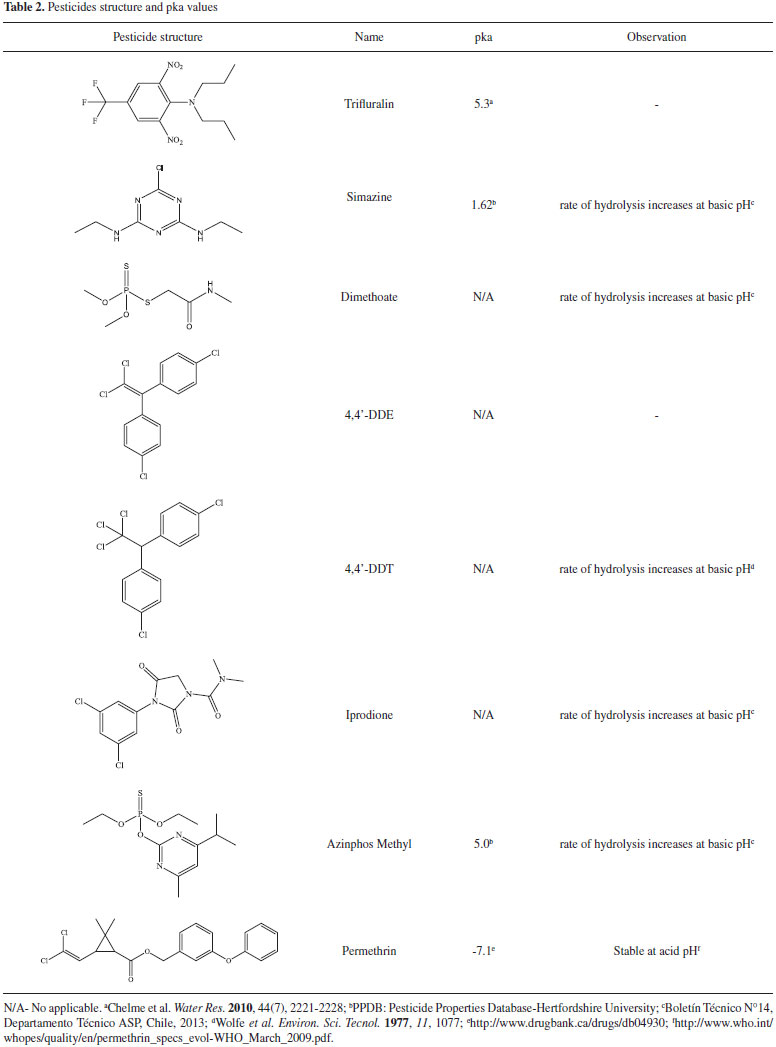 RESULTS AND DISCUSSION Soil characterization Humidity, pH and conductivity of uncultivated soil and organic farming soil were measured. As can be seen in Table I, both soils had similar percentage of humidity. The organic farming soil that was used for organic tomato cultivation showed slightly acidic pH, as expected. This pH value was higher than the one founded on uncultivated soil. The electric conductivity (EC) indicates that both soils had low indirect salinity values, meaning a low amount of soluble salts.37 Although, as expected, the organic farming soil presented slightly higher soluble salt content than the uncultivated soil. Pesticides The pesticides structure and acid dissociation constant (pka) values are shown in Table II. The pka values indicate that we have acidic pesticides like simazine but also strong basics such as permethrin. In order to make a simultaneous determination of these pesticides it was necessary to make a compromise, also taking into account some reports about the rate of hydrolysis of some pesticides with pH. So we determined to work under buffered conditions with pH values of about 5 to 5.5 to protect the base and acid sensitive species, also allowing the extraction of the acids. Selectivity The presence of interferent compounds in the soil matrix, from the studied pesticides retention time segments, was determined through GC/MS-SIR analysis for both soil (uncultivated and organic), after its extraction by QuEChERS. Both soils chromatograms: uncultivated (bottom chromatogram) and organic (medium chromatogram) were compared in Figure 1, with the 0.8 mg kg-1 pesticide spiked uncultivated soil extract (upper chromatogram).