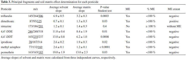 CONCLUSIONS For the multi-residues method 87.5% of the studied pesticides were affected by the presence of the soil matrix; therefore the quantitation must be carried out in the presence of the matrix. 75% showed negative matrix effect (detection signal suppression), while dimethoate enhanced its chromatography response. Only the herbicide simazine was not influenced by the matrix of soil. The extraction by buffered citrate solid phase dispersion methodology had acceptable recoveries between 62 to 99%, except for iprodione with low recovery at concentration near its quantification limits. The clean-up step with absorbents was not necessary. Intermediate precision values were in general < 20%. LOD values range from 0.003 (4,4'-DDE) to 0.2 mg kg-1 (dimethoate) and LOQ goes from 0.01 to 0.5 mg kg-1. Dimethoate, simazine, 4,4'-DDT and iprodione had the higher quantification limits > 0.1 mg kg-1. The method was shown to be effective for extraction and quantification of pesticide from soil matrix with different physico-chemical properties, except for iprodione. But this compound could be quantified at concentrations higher than 0.2 mg kg-1 using the matrix match calibration procedure.