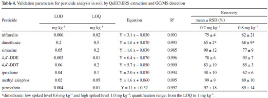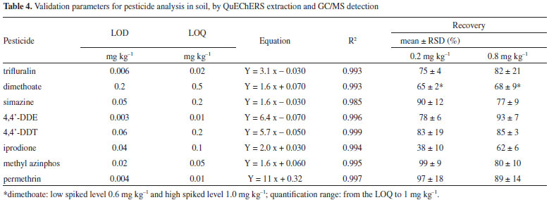 Detection and quantification limits The detection limit (LOD), for each pesticide, was calculated as the concentration corresponding to three times of the standard deviation (3S) of ten independent soil matrix blanks and; the quantification limit (LOQ) was based on ten times the standard deviation (10S). The detection and quantification method limit was calculated considering the internal standard and the matrix match calibration slope. The obtained LOD and LOQ values for trifluralin, dimethoate, simazine, 4,4'-DDE, 4,4'-DDT, iprodione, methyl azinphos and permethrin are presented in Table IV with other validation results. LOD values ranged from 0.003 to 0.05 mg kg-1 in accord with Lesueur2 (0.003 and 0.09 mg kg-1), and in general with the values for GC/MS detection reported by Vera et al.39 except for dimethoate 0.2 mg kg-1.