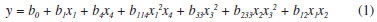 RESULTS AND DISCUSSION Traditionally, the development of chromatographic methods has been performed by studying the chromatographic characteristics observed in an exploratory run. This approach normally varies the concentration of the organic solvent by time, e.g. 5-100% over one or two hours.20 The analyst uses a visual inspection of the chromatograms to decide whether it is necessary to optimize other parameters that can contribute to chromatographic resolution, such as pH, organic modifier, stationary phase, gradient range, and slope. The development of methods using UHPLC technology have more advantages that HPLC technology, i.e. they are faster, have a higher power resolution and provide a reduction in the amount of sample, solvent and development costs; consequently they provide many of the benefits of green chemistry.29 To obtain experiments that will provide more knowledge about the interaction of the main factors which are responsible for the quality of the separation, QbD principles with DOE are necessary. In our study we used a user-friendly QbD-DOE software that interfaced with the LC equipment and supported the chromatographer in all stages of the experimental design. The adopted criteria were the highest number of peaks with a resolution higher than 1.5 and asymmetry of peak < 2. These criteria were chosen to identify a chromatogram that could identify the greatest amount of chemical information present in the extract (fingerprint), and which also had good enough resolution to detect and quantify the main phytochemical markers of I. paraguariensis. Initially, the qualitative factors selected for screening were the column, mobile phase pH range, gradient time and organic modifier. The experiments totaled 45 runs and the results showed the best response when using a BEH C8 column, acid pH (pH=2.4), 12 min of gradient time and methanol as organic modifier for the analyzed matrix (Table 1S in the SM, condition 33). After the screening study, the critical factors that influenced the selectivity of the method were evaluated. The experimental design, which was obtained through 39 experiments, showed the effect of each factor in the response (Table 2S in the SM). Different responses may be selected during this stage, depending on the objective of the study.21 Different regression models, (linear, quadratic and cubic) were tested during both stages. The cubic model was adopted in this study because it showed the greatest r2 value and it did not present lack of fit (p < 0.05). During the optimization stage, the following regression equation was obtained (Equation 1). ![]() where y is the number of peaks (Rs > 1.5); b0 is the constant; b1 is the flow rate; b2 is the final concentration of organic modifier; b3 is the temperature; and b4 is the pH. The multiplication among coefficients represents the interactions and the x values are the experimental parameters applied to each factor. The cubic regression model presented a r2 value of 0.9544, showing the correlation between the evaluated parameters and the response. The coefficients were subjected to analysis of variance (ANOVA) and the highest statistical significances were found for b1, b4 and b33 (p<0.001), indicating their importance in the modulation of the y response. One way to graphically interpret the interaction between the factors is by means of a three-dimensional graph, which is called response surface, and which plots the factors two by two according to the response. Figure 1 demonstrates the negative effect of the flow and of the concentration of the organic modifier on the number of peaks. Although crude extracts contain a lot of compounds (secondary metabolites) that can lead to a inadequate separation of these compounds in an adequate time analysis, in our study the optimized condition that were obtained made it possible to achieve a higher number of peaks with resolution greater than 1.5. These were obtained in conditions of low flow rate and a final organic level of up to 55%. Aproximately 17 peaks were found in the optimum flow condition of the chromatographic pump, pH and the final level of the organic solvent (Table 2S in the SM, condition 14).