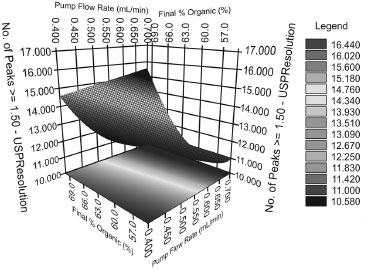 ![]() Figure 1. Response surface: flow rate/final concentration of organic modifier (MeOH) versus number of peaks with R > 1.5
