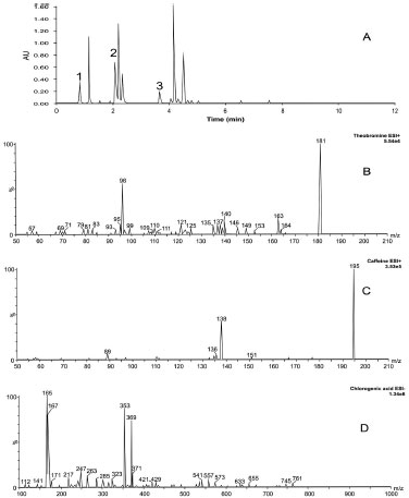 After the optimized chromatographic condition was achieved, these parameters were applied in the UHPLC-MS analyses to search in the samples of the three selected markers: theobromine, chlorogenic acid and caffeine. These metabolites are generally related to I. paraguariensis and are found in high concentrations. Furthermore, theobromine and caffeine are responsible for the stimulating effect of the plant and chlorogenic acid is an important antioxidizing agent.30,31 The UHPLC-MS analyses for theobromine and caffeine were carried out in the positive ion mode because these compounds have basic groups and it is relatively easy for these compounds to be protonated. The analyses in the positive mode showed peaks at m/z 181.1 [M+H]+ for theobromine and m/z 195.0 [M+H]+ for caffeine. On the other hand, for the chlorogenic acid (which is easier to deprotonate and analyze using the negative ion mode) a peak at m/z 353.0 [M-H]- was verified (Figure 2) The results that were obtained were attributed to the ions of the three markers, which are normally found in I. paraguariensis extracts.12 The main fragments (daughter ions) observed in the positive mode were m/z 96 [M+H]+ and m/z 138 [M+H]+, which were attributed to theobromine and caffeine molecules, respectively. For the chlorogenic acid molecular analysis in the negative mode, the daughter ion fragment was m/z 165 [M-H]-. These experiments confirmed the presence of these three markers and the results described in the literature.12,14