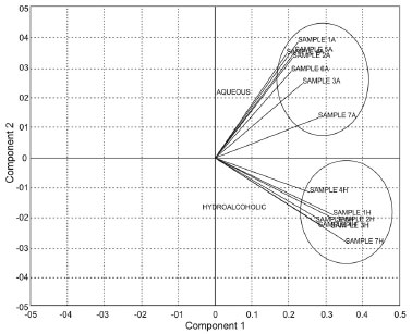 ![]() Figure 4. PCA analyses of the hydroalcoholic (H) and aqueous (A) extracts of Ilex paraguariensis