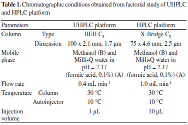 The same optimized chromatographic conditions obtained through the processing of this data using UHPLC were simulated for the HPLC platform (Table 1) using Selectivity Chart and Acquity Columns Calculator sofware (Waters Corporation, Milford, MA).