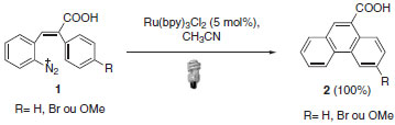 O emprego destes complexos metálicos na área de inorgânica e de materiais é amplamente estudado e encontram-se aplicados à formação de H2 e O2 a partir da água,5 redução de CO2 em CH4,6 células solares sensíveis a corantes7 e reações de polimerização.8 Em contrapartida, o uso dos complexos em síntese orgânica era observado apenas pontualmente até pouco tempo atrás. Um dos primeiros trabalhos nesta área foi em 1984. Cano-Yelo e Deronzier desenvolveram a síntese do ácido fenatreno-9-carboxílico (2) através do uso da reação de Pschorr catalisada por Ru(bpy)3+2 e mediada por luz visível (Esquema 1).9
