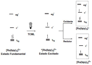 O processo de formação do estado excitado do complexo de Ru é denominado como processo de Transferência de Carga Metal-Ligante (TCML) e é responsável pela oxidação do metal e redução do ligante. O estado excitado tripleto de mais baixa energia, *[Ru(bpy)3]+2, pode atuar com oxidante ou redutor, ativando moléculas orgânicas externas (Esquema 3).16