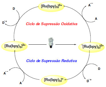 As reações químicas de transferência de elétrons entre o estado excitado e moléculas doadoras (D) ou aceptoras (A) podem ser feitas por intermediação de dois ciclos distintos: ciclo de supressão redutiva ou ciclo de supressão oxidativa (Esquema 4).