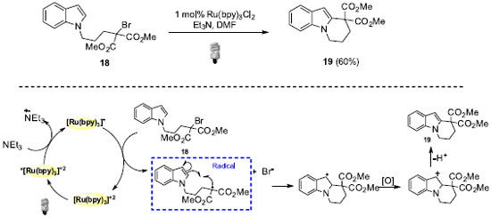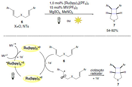 O produto ciclizado pode ser obtido empregando-se bis-alcenos ricos em elétrons (6), na presença de luz visível, fotocatalisador [Ru(bpy)3]+2 e metil viologênio (MV+2) como aceptor de elétrons. A oxidação de aminas é um item a ser destacado dentro da catálise foto redox oxidativa. Isto se deve ao caráter doador de elétrons desta classe, o que possibilita a oxidação das mesmas por doação de um elétron e formação do intermediário reativo cátion radicalar. Como indicado no Esquema 6, os intermediários formados (íon imínio) são potentes eletrófilos e úteis para a formação de novas ligações em posição α das aminas.