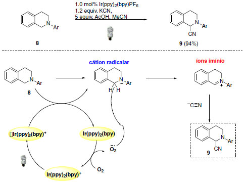 A reação de α-cianação demostrada por Koenigs e colaboradores fornece acesso a aminonitrilas através de ativação da ligação C-H.22,23 Para esta transformação, cianeto de potássio foi utilizado como provedor de cianeto e ácido acético atua como co-catalisador, liberando ácido cianídrico em solução. Nestas condições e com apenas 1,0 mol% de fotocatalisador de irídio forneceu o produto de α-cianação com 94% de rendimento. O fotocatalisador de irídio Ir(ppy)2(bpy)PF6, em seu estado excitado, é capaz de oxidar N-feniltetrahidroisoquinolina (8) ao cátion radicalar. Oxigênio molecular participa do ciclo catalítico e apresenta como função a reoxidação do fotocatalisador e formação do ânion superóxido (O2-). O ânion superóxido, por sua vez, atua interagindo com o hidrogênio do cátion radicalar para a formação do íon imínio (9). Ao mesmo tempo, os autores sugerem também um caminho mecanístico iônico para a formação do íon imínio. Nesse aspecto, o cátion radicalar poderia ser desprotonado na posição α e o radical α-amina (10) poderia ser estabilizado pela sobreposição do orbital não-ligante preenchido do nitrogênio (Esquema 8).23