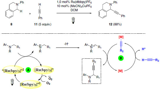 Ainda sob o contexto de α-funcionalização de aminas através da ativação de ligações C(sp3)-H, Vila e colaboradores descreveram o primeiro exemplo de uso simultâneo de oxidação aeróbica mediada por luz visível e catálise metálica.24 Como pode ser observado no Esquema 9, essa metodologia proporcionou a formação de uma nova ligação C-C através da adição do alcino 11. O produto 12 foi obtido com 88% de rendimento.