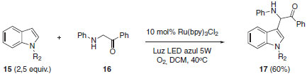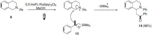 O mecanismo proposto sugere a formação do íon imínio através da abstração de hidrogênio do cátion radicalar pelo superóxido formado na etapa de regeneração do catalisador. O íon imínio, formado no ciclo A, irá participar do segundo ciclo através de reação de adição 1,2 pelo acetileto de cobre formado no ciclo B. A eficiência da catálise dupla empregada neste exemplo se deve, principalmente, à compatibilidade entre as diferentes catálises empregadas. Nesse tipo de metodologia, onde há vários reagentes com funções particulares, todos os componentes devem ser cuidadosamente analisados. Fatores como a fonte de luz, tipo de fotocatalisador e catalisador metálico usado no segundo ciclo é crucial para o sucesso reacional.25 Muitos outros exemplos poderiam ainda ser empregados para enfatizar a ampla aplicação das reações foto redox por supressão oxidativa.26-28 Dentre eles, pode-se destacar a importância de obtenção de produtos tipo Mannich e a α-arilação de compostos α-aminocarbonílicos.29,30 O produto tipo Mannich 14, onde o íon imínio formado pela catálise foto redox é interceptado pelo silil enol éter 13, foi isolado com 96% de rendimento (Esquema 10).31