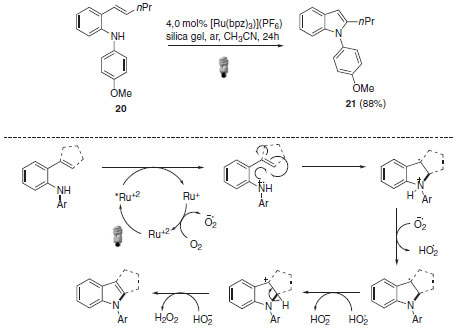 Em termos do mecanismo, o intermediário radicalar é formado via redução da ligação C-Br simultaneamente com a reoxidação da espécie fotocatalítica de rutênio. Essas características associadas à formação do radical benzílico como intermediário são responsáveis pelo sucesso dessa abordagem. Recentemente, Zheng e colaboradores evidenciaram o uso de catálise foto redox para a formação de ligação C-N através da preparação foto catalítica de N-aril indol (Esquema 13).34 Os derivados indólicos de interesse foram obtidos após subsequentes etapas de oxidação e aromatização e com rendimentos de até 88%.