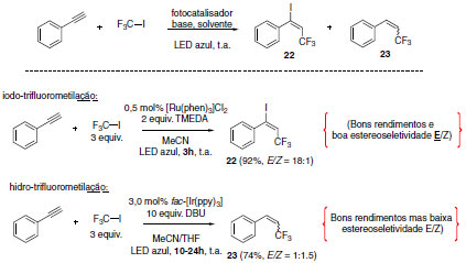 Inicialmente, as reações de iodotrifluorometilação e hidrotrifluorometilação foram optimizadas a partir do emprego de diferentes fotocatalisadores e bases.41 A condição ideal para a metodologia de iodotrifluorometilação foi o emprego do fotocatalisador [Ru(phen)3]Cl2 (0,5 mol%), 2 equivalentes de base TMEDA (N,N,N',N'-tetrametiletilenodiamina) em acetonitrila e mediada por luz Led azul por 3 h à temperatura ambiente. Para obtenção dos produtos da hidrotrifluorometilação, as condições ideais foram o emprego do fotocatalisador fac-[Ir(ppy)3] (3,0 mol%) e 10 equivalentes de base DBU com irradiação prolongada da mesma fonte de luz visível (Esquema 15). Como resultado, altas seletividades em favor do isômero E foram alcançadas na reação de iodotrifluorometilação (relação E/Z = 18:1).