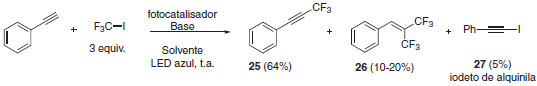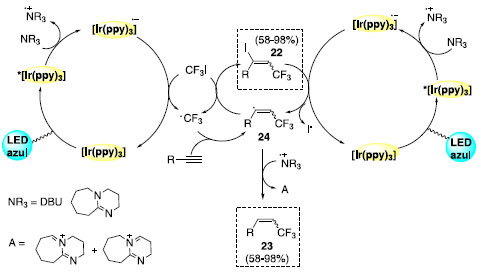 O mecanismo para a hidrotrifluorometilação de alcinos é iniciado pela foto excitação do catalisador seguido da redução do mesmo pela base. O ânion radicalar metálico é a espécie responsável pela redução da ligação CF3-I, com simultânea regeneração do fotocatalisador. A espécie radicalar CF3 é adicionada ao alcino e fornece o radical vinílico 24, que por sua vez abstrai o hidrogênio da base para a formação do produto 23. O produto da reação de iodotrifluorometilação pode ser obtido em competição no ciclo catalítico por abstração de iodeto diretamente do reagente CF3I. O mecanismo sugere a ideia de reação de catálise em cascata através da de-iodinação de 22. Logo, a espécie 22 também pode estar envolvida no mecanismo de hidrotrifluorometilação (Esquema 16).