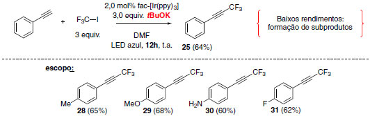 A metodologia de trifluorometilação de alcinos mostrou-se menos eficiente que as reações de iodotrifluorometilação e hidrotrifluorometilação. O rendimento máximo obtido no escopo da reação foi de 68% e isto se deve à formação de subprodutos bistrifluorometilado (rendimento de aproximadamente 15%) e iodeto de alquinila (em torno de 5%) (Esquema 17).