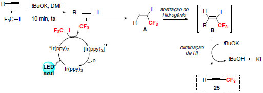 Uma proposta de mecanismo para esta reação envolve formação de iodeto de alquinila e posterior interação com o radical CF3 formado através de catálise foto redox. O radical alquenil trifluorometilado A, originado na etapa citada anteriormente, poderá abstrair um próton levando à formação do intermediário B com posterior eliminação de HI (Esquema 19).