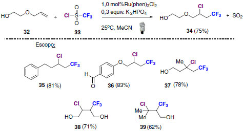 REAÇÕES FOTO REDOX NEUTRAS Apesar da diversidade de aplicações em síntese via reações foto redox por supressão redutiva e oxidativa, as aplicações atuais na área de catálise foto redox mediada por luz visível apresentam-se voltadas para caminhos reacionais neutros.42 A utilização de substâncias em quantidades estequiométricas como fonte e reservatório de elétrons é um problema que pode ser contornado por intermédio desta classe de reações.43 Para esta finalidade, os materiais de partida de reações foto redox neutras devem participar simultaneamente dos processos de oxidação e redução em diferentes pontos do ciclo catalítico, dispensando o uso extra de compostos oxidantes e redutores quantitativos.44 Como resultado, os materiais de partida e os produtos obtidos devem apresentar o mesmo número de oxidação.45 Em 2014, um exemplo foi descrito de bifuncionalização de alcenos através de metodologia foto redox neutra. Nesta reação foi possível introduzir os grupos CF3 e Cl à dupla ligação com formação de apenas dióxido de enxofre como produto secundário.46 Os produtos bifuncionalizados puderam ser sintetizados em rendimentos de até 83% (Esquema 20).