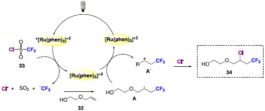 O ciclo catalítico proposto na reação de bifuncionalização de alcenos aborda a excitação do catalisador metálico para a formação do estado excitado *[Ru(phen)3]+2. O estado excitado irá atuar com agente redutor e a espécie radicalar de cloreto de trifluorometanosulfonila dá origem à espécie radicalar de CF3, dióxido de enxofre e íon cloreto. O radical CF3 será inserido na dupla ligação do alceno com formação do intermediário radicalar (A), que por sua vez tem função de regenerar o fotocatalisador através da doação de um elétron. O cátion (A') formado nesse processo irá interagir com o íon cloreto presente no meio reacional para a bifuncionalização dos alcenos (Esquema 21).