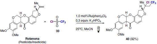Uma interessante aplicação para a metodologia mostrada anteriormente é a funcionalização de duplas ligações em compostos biologicamente ativos. A Rotenona, uma substância com caráter pesticida e inseticida, foi utilizada com êxito como material de partida para obtenção de seu análogo cloro-trifluorometilado (40) com rendimento de 92% (Esquema 22).