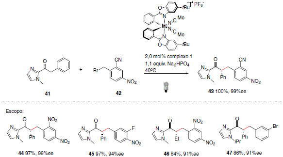 Uma aplicação eficaz desses complexos está relacionada com a síntese de 2-acilimidazol α-alquilado. A metodologia desenvolvida na formação de novas ligações C-C exibe elevados rendimentos e excesso enantiomérico (Esquema 23).49 Os complexos metálicos mencionados anteriormente desempenharam diferentes funções no mecanismo da reação, tais como, foto catalisador, ácido de Lewis e também como ativador do substrato 2-acilimidazol.