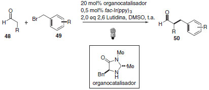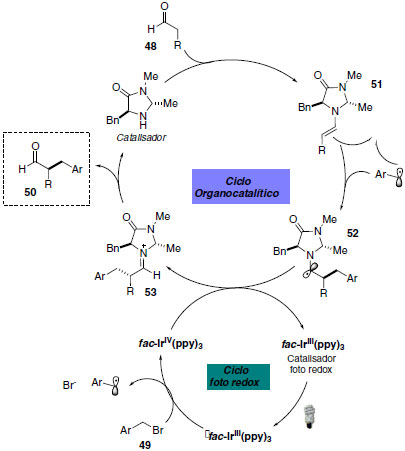 No mecanismo da organocatálise foto redox, o complexo de irídio em seu estado excitado apresenta caráter altamente redutor e pode transferir um elétron para o brometo de benzila com formação do radical eletrofílico benzílico e íon brometo. Simultaneamente, há condensação do organocatalisador (imidazolidinona) com o aldeído 48 com resultante formação da enamina quiral 51. A formação da ligação C-C e do radical α-amino 52 se deve à adição do radical eletrofílico à enamina. A interseção dos ciclos catalíticos é responsável pela oxidação de 52 para regenerar o foto catalisador e formação do íon imínio 53. Através da hidrólise do imínio 53 o organocatalisador é regenerado e fornece os produtos α-benzilados (Esquema 25).