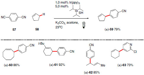 ![]() Esquema 26. Reação de arilação de ligações alílica C(sp3)-H desenvolvida por MacMillan e colaboradores