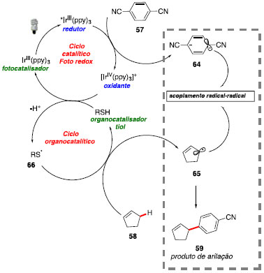O fotocatalisador metálico, após ser excitado com luz visível, pode transferir um elétron para arenos deficientes em elétrons para formação do ânion radicalar areno 64. A espécie de IrIV só atua na oxidação do organocatalisador tiol em presença de base. Isto se deve à desprotonação do tiol (pKa = 7,91)54 pela base para formação do íon tiolato, que por sua vez, apresenta menor potencial de redução e pode ser prontamente oxidado pelo foto catalisador. Em seguida, o radical 66 formado atua abstraindo um próton do alceno fornecendo o radical alílico 65 e regenerando o organocatalisador. A nova ligação C-C tem origem a partir do acoplamento intermolecular entre os radicais 64 e 65, seguido de aromatização via eliminação de cianeto (Esquema 27).