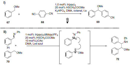 Dentro desta abordagem de catálise dupla e ativação de ligação C-H foram ainda descritas a arilação direta de éteres benzílicos55 e a metodologia de acoplamento de éteres benzílicos com aldiminas para fornecer β-aminoéteres (Esquema 28).56 Em ambos os casos o mecanismo envolve o acoplamento direto das espécies radicalares geradas cataliticamente nos ciclos envolvidos.