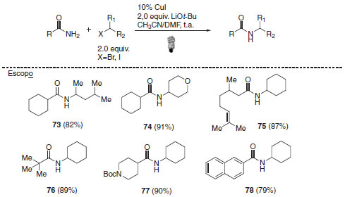 Além da combinação da catálise foto redox e organocatálise, a interação entre catálise foto redox e catálise metálica57 também pode representar uma nova rota de síntese não convencional. Há vários exemplos na literatura que empregam, dentre outros metais, ouro,57 cobre,58 níquel,59 paládio.60 Os complexos de metais de transição cobre, níquel e ouro também podem apresentar função fotocatalítica, substituindo os tradicionais complexos de rutênio e irídio empregados em catálise foto redox.61-64 A reação de alquilação foto induzida de amidas catalisada por cobre desenvolvida por Fu e colaboradores ilustra a aplicação desta classe de foto catalisadores.65 Nessa metodologia, diferentes haletos secundários cíclicos e acíclicos foram empregados de forma eficaz, além da alta tolerância funcional exibida pela reação. O escopo pode ser aplicado a amidas primária alifáticas, incluindo exemplos de grupos impedidos do ponto de vista estéreo e ainda alquilação de amidas aromáticas e α.β-insaturadas (Esquema 29).