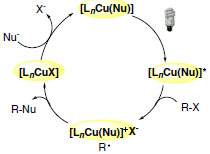 Um dos prováveis caminhos mecanísticos proposto pelos autores postula que o complexo de cobre(I) [LnCu(Nu)] formado apresenta papel de destaque no ciclo catalítico sofrendo excitação na presença de luz visível e possibilitando a transferência de elétrons. O estado excitado de Cu(I) seria suficientemente redutor para transferir um elétron para o aduto eletrofílico com formação de radical alquila. A interação entre a espécie foto catalítica oxidada e o radical alquila dá origem ao produto de interesse e o nucleófilo presente no meio reacional atua na regeneração da espécie foto sensível para reiniciar o ciclo catalítico (Esquema 30).