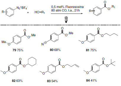 Além dos catalisadores metálicos, alguns corantes orgânicos podem interagir com a luz visível para a formação de um estado excitado que pode interagir com outros substratos orgânicos em reações de catálise foto redox. O uso de corantes como foto catalisadores apresenta algumas vantagens quando comparado ao uso dos usuais complexos de rutênio e irídio. De maneira geral, os corantes orgânicos apresentam baixo custo e são menos tóxicos. Logo, essas substâncias são mais fáceis de serem manuseadas e agridem menos o meio ambiente quando comparadas aos catalisadores metálicos.63 Um exemplo recente da aplicação de corantes orgânicos como foto catalisadores desenvolvidos por Xiao e colaboradores aborda a alcoxicarbonilação radicalar de sais de arildiazônio mediada por luz visível.66 As condições reacionais otimizadas empregadas foram 0,5 mol% de fluoresceína, 80 atm de monóxido de carbono e irradiação de luz Led azul de 16 W em metanol (Esquema 31).