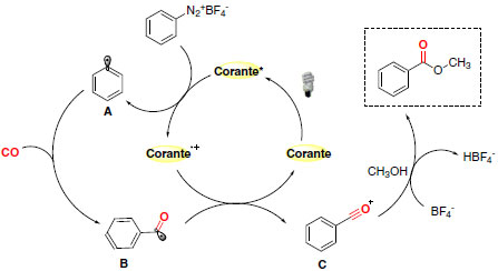 Foram empregados grupos substituintes doadores e retiradores no anel aromático dos sais de arildiazônio e diferentes álcoois alifáticos para comprovar a eficiência da metodologia desenvolvida. O mecanismo proposto mostra a redução do substrato arildiazônio pelo catalisador foto excitado com formação da espécie fenil radicalar A (Esquema 32). Posterior interação com monóxido de carbono origina o radical B, que por sua vez atua como agente redutor para regenerar o foto catalisador e fornecer a espécie C. Os ésteres sintetizados por alcoxicarbonilação são provenientes da reação de C com o álcool (metanol).