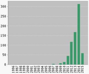 ![]() Figura 2. Número de publicações sobre "catálise foto redox" nos últimos 20 anos (Web of Science 13/03/15)