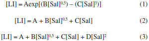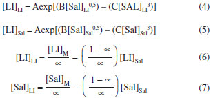 PARTE EXPERIMENTAL Materiais O líquido iônico cloreto de 1-butil-3-metilimidazólio, [C4mim][Cl] e o sal inorgânico fosfato de potássio dibásico anidro (K2HPO4) foram adquiridos da Sigma Aldrich (EUA). As proteínas α-la e β-lg foram doadas pela Davisco Food Ingredientes International (Eden Praire, USA). A lactoferrina foi cedida pela DMV International (Veghel, Holanda). Curvas binodais e dados de equilíbrio As curvas de equilíbrio foram obtidas por meio da titulação turbidimétrica, metodologia que consiste em titular uma determinada quantidade de líquido iônico gotejando a solução aquosa de sal inorgânico até que a mistura final se torne turva.29 Para tanto, inicialmente, soluções estoque do LI a 70% m/m e de sal com concentração total 40% m/m foram preparadas. Aproximadamente 1 g de solução de LI foi então transferida para um tubo de ensaio de vidro, que foi colocado no interior de um banho termostático (170M020, Matoli, Brazil) à temperatura de trabalho (25 ºC). Após atingir a temperatura desejada, alíquotas de 20 µL da solução de sal foram adicionadas com auxílio de uma micropipeta ao tubo e o sistema foi misturado com a ajuda de um agitador de soluções tipo vortex (Phoenix Luferco, AP 56). Após, foi deixado em repouso durante alguns minutos dentro do banho até que o turvamento da solução final pudesse ser notado (região bifásica). Em seguida, alíquotas de água ultrapura foram adicionadas para que o sistema voltasse ao estado límpido (região monofásica). Para cada ponto de turvamento identificado, a composição global do sistema (concentração de LI, água e sal) foi determinada a partir da massa total do sistema e das quantidades de sal, LI e água adicionadas antes da observação do turvamento. Este processo de titulação foi repetido até a obtenção de uma quantidade suficiente de pontos para a formação da curva binodal, de maneira que os pontos de turvamento foram considerados como pontos da curva de equilíbrio. Posteriormente, as curvas binodais obtidas experimentalmente foram correlacionadas às Equações 1, 2 e 3 utilizando o software SAS (SAS versão 9.0, Cary, NC, SAS Institute, Inc., 1998, licenciado para uso pela Universidade Federal de Viçosa). A Equação 1 representa o modelo matemático de Merchuk et al.30 usado para correlacionar pontos experimentais em sistemas contendo polímeros. A Equação 231 é outro modelo empírico também utilizado para correlacionar os dados binodais de sistemas polímero-sal. A Equação 3 foi utilizada por Han et al.32 para correlacionar os dados das binodais de sistemas formados por LI baseados no cátion imidazólio e sais orgânicos. ![]() onde [LI] e [Sal] são as composições em fração mássica do líquido iônico e do sal, respectivamente; e A, B, C e D são os parâmetros de ajuste dos modelos. Linhas de amarração Após a determinação das curvas de equilíbrio, as linhas de amarração foram obtidas utilizando o método gravimétrico descrito por Merchuk et al.30 Foram utilizados quatro pontos globais. A partir das concentrações (% m/m) pré-definidas de sal, LI e água, quatro sistemas foram preparados através da pesagem dos componentes (BEL Engineering, M 214 A) para uma massa total de 10 g, em tubos de centrífuga graduados de volume de 15 mL. Os tubos foram agitados vigorosamente e então centrifugados (FANEM, Excelsa II 206 BL) a 3500 rpm por 5 minutos a fim de acelerar a separação de fases. Posteriormente, os tubos foram mantidos em repouso durante 12 horas em estufa (FANEM, 502, Brasil) a 25±1 ºC. Após o período especificado, os volumes das fases foram medidos e as fases foram, então, separadas e pesadas. Para determinação da concentração de cada componente (LI, sal e água) nas fases coletadas, um sistema de quatro equações (Equações 4-7) e quatro variáveis desconhecidas ([LI]LI, [LI]Sal, [LI]LI, [Sal]Sal) foi resolvido33 no software Engineering Equation Solver (EES), Comercial Version 6.883-3D (2003). ![]() onde os índices subscritos LI, Sal e M representam a fase superior (rica em LI), a fase inferior (rica em sal) e a composição global da mistura, respectivamente. O parâmetro α é a razão entre a massa da fase superior e a massa total da mistura, característico da regra da alavanca. O comprimento da linha de amarração foi determinado por meio da Equação 8. ![]() Partição das proteínas em SAB Os experimentos de partição foram realizados em tubos de centrífuga graduados de 15 mL para uma massa total de 12 g. Adicionou-se, aos tubos, uma massa de 10 mg de proteína. Os SAB foram preparados através da pesagem dos componentes e, então, agitados, centrifugados e mantidos em repouso em estufa (25±1 ºC), por 12 horas. Então as suas fases foram separadas, como descrito para o procedimento de determinação das linhas de amarração no item anterior. A temperatura de trabalho foi mantida a 25±1 ºC. Os experimentos foram realizados em duas repetições. O conteúdo de proteína em cada uma das fases foi determinado utilizando o método espectrofotométrico (Cary 50 Probe, Varian, EUA), por leitura direta da absorbância a 280 nm. No intuito de evitar a interferência do sal e do LI no método de quantificação das proteínas, amostras de controle (branco) constituídas apenas por LI, sal e água foram utilizadas em todas as leituras. Uma curva analítica foi previamente preparada para cada proteína. A distribuição da proteína nas fases do sistema foi determinada a partir do coeficiente de partição (Kp), resultado da razão entre as concentrações de proteína da fase superior e inferior (Equação 9). O coeficiente de partição foi utilizado para quantificar o grau de separação alcançado no processo de extração. ![]() onde CLI e CSal são as concentrações de proteína na fase superior e inferior, respectivamente. Para que se possa selecionar o SAB com melhor capacidade de extração das proteínas estudadas, f