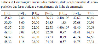 As linhas de amarração foram determinadas através da predição matemática da composição de cada fase dos sistemas bifásicos formados. As composições das fases superior e inferior, a composição das misturas iniciais e os comprimentos das linhas de amarração (TLL) estão dispostos na Tabela 2.