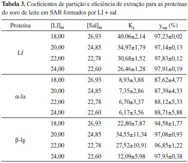 Analisando os dados da Tabela 2, observa-se um aumento do TLL com o aumento das composições globais de sal e LI para todas as combinações LI + sal consideradas. Quanto maior o conteúdo do composto formador de fase, mais distante é o ponto de mistura global da curva binodal e, portanto, espera-se uma maior diferença nas propriedades intensivas entre as fases formadas. Esse aumento do TLL também pode ser notado na Figura 1. Considerando a regra da alavanca, observa-se na Figura 1 que as composições de mistura definidas forneceram fases (superior e inferior) de volumes aproximadamente iguais, estando os pontos de mistura aproximadamente na metade das linhas de amarração. Partição de proteínas em SAB A partição das proteínas foi testada para os quatro diferentes pontos de mistura globais utilizados para determinação das linhas de amarração. A Tabela 3 apresenta os valores de coeficiente de partição e eficiência de extração para as proteínas do soro de leite estudadas.