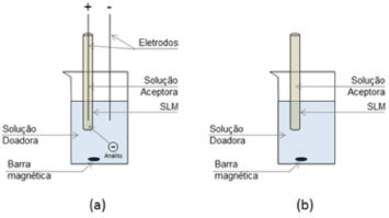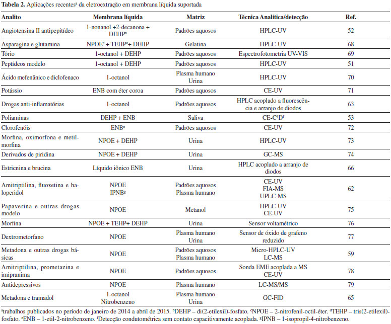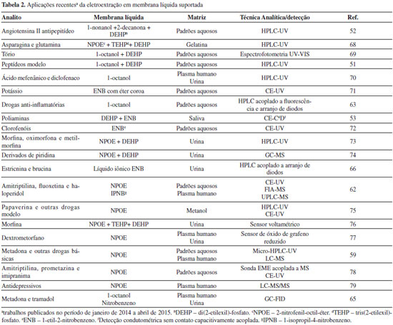 Eletroextração em membrana A eletroextração em membrana (EME) tem se mostrado especialmente interessante em preparo de amostras, quando comparada a outras técnicas de microextração em fase líquida, devido ao reduzido tempo exigido para a obtenção de valores significativos de recuperação de analitos. Em adição, EME têm sido utilizada para a extração de drogas, metais pesados e peptídeos em diversos tipos de matrizes, desde as mais simples (aquosas) a fluídos corporais, como leite materno e sangue.38 EME pode ser facilmente automatizada e miniaturizada, além de proporcionar elevados fatores de pré-concentração de analitos, cujas soluções podem ser diretamente injetadas em sistemas analíticos de separação.9,39 Esta seção será focada nos fundamentos da EME, nos parâmetros relevantes que influenciam a extração, suas vantagens, limitações, aplicações e perspectivas futuras. Fundamentos A EME é uma técnica de microextração em fase líquida cuja força motriz é a diferença de potencial aplicada entre duas fases líquidas (doadora e aceptora), as quais são separadas por uma membrana líquida suportada (supported liquid membrane - SLM).9 Os primeiros trabalhos15 com EME foram publicados em 2006 e desde então, dentre vários avanços, esforços têm sido voltados para a modelagem teórica e melhor entendimento dos fundamentos da técnica. O aparato experimental empregado na EME é bastante similar ao utilizado na microextração em fibra oca (HF-LPME), como pode ser observado no esquema apresentado na Figura 2, que evidencia as similaridades entre as técnicas.