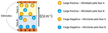 ![]() Figura 3. Diagrama da eletroforese bifásica. As moléculas são separadas de acordo com sua carga e a sua afinidade pelas fases presentes no sistema