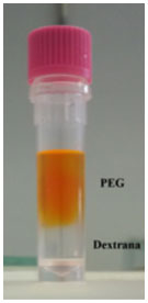 ![]() Figura 4. Distribuição do corante (amarelo VI) entre fases de PEG (superior) e dextrana (inferior)