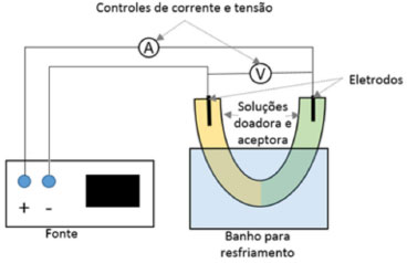 ELETROEXTRAÇÃO LÍQUIDO-LÍQUIDO SEM MEMBRANAS A extração líquido-líquido sem membranas,14,80 também conhecida pelos nomes de eletroforese bifásica e eletropartição,81 consiste na aplicação de um campo elétrico perpendicular à interface entre dois líquidos imiscíveis. Com isso, a distribuição final das espécies entre as fases é governada tanto pela mobilidade eletroforética do analito quanto por sua constante de distribuição entre as fases (Figura 3).