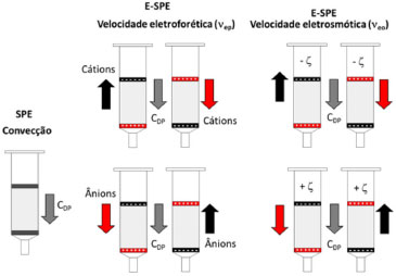 ![]() Figura 7. Representação do movimento de convecção presente em SPE associados aos movimentos eletroforéticos (eletrosmose, νeo e migração eletroforética, νep) em E-SPE. Movimento de convecção promovido por diferença de pressão presente em SPE e E-SPE, CDP ( ); Movimentos eletroforéticos em contrafluxo ( ) ou pró-fluxo ( ) da νep e νeo em função da carga do analito (cátion ou ânion) e do potencial zeta do sorvente (-ζ ou +ζ) presentes em E-SPE