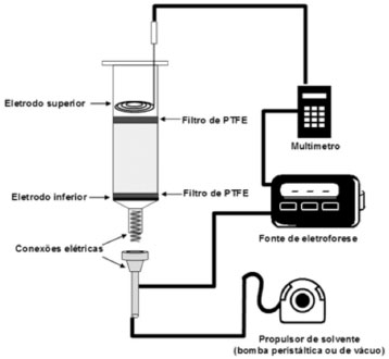 Posteriormente, Orlando et al.111 avaliaram a E-SPE para a extração do antimicrobiano marbofloxacina em sua forma catiônica em amostras de leite. Dependendo da polaridade empregada nos eletrodos a recuperação dos analitos foi aumentada (2,3 vezes) ou diminuída (4,2 vezes) em relação à extração sem aplicação de campo elétrico. Estes resultados comprovaram, pela primeira vez, que a E-SPE possui grande potencial para ser empregada em amostras complexas. Em 2014, Ribeiro118 explorou a E-SPE visando melhorar a eliminação de interferentes e também elevar a recuperação de seis quinolonas e seis sulfonamidas em amostras de ovos. Os melhores resultados foram obtidos aplicando o campo elétrico tanto nas etapas de limpeza como na eluição. O objetivo desta estratégia foi forçar a permanência dos analitos aniônicos nos cartuchos na etapa de limpeza e posteriormente facilitar a saída destes durante a eluição, sem a necessidade de empregar grandes quantidades de solvente orgânico. Os resultados de recuperação obtidos coma E-SPE foram superiores a SPE para todas as quinolonas e sulfonamidas avaliadas. A maior diferença de recuperação observada foi para a quinolona enrofloxacina (84% E-SPE versus 1% SPE) ao passo que a menor diferença foi para a quinolona norfloxacina (69% E-SPE versus 37% SPE). Além dos resultados superiores de recuperação obtidos com o emprego da E-SPE, ficou comprovado que a presença de interferentes no extrato final foi diminuída por empregar menores teores de solvente orgânico para a eluição dos analitos. Outra recente abordagem de aplicação de campo elétrico em procedimentos envolvendo extração sólido-líquido foi apresentada em uma patente recente.119 Nessa patente o uso de campo elétrico foi avaliado pela primeira vez na dispersão da matriz em fase sólida (MSPD, do inglês matrix solid phase dispersion). A MSPD convencional é uma técnica de preparo de amostras baseada na sorção diferencial dos analitos e interferentes em um agente dispersante e, por isso, compartilha alguns princípios com a técnica de SPE.109 De forma geral, a extração MSPD em sua forma mais simplificada é realizada em duas etapas principais. A primeira é a etapa da dispersão que é realizada a partir da mistura e trituração da matriz (sólida, semi-sólida ou líquida) em um sorvente sólido capaz de sorver preferencialmente os interferentes. Nesta etapa, o agente dispersante é capaz de romper partículas e/ou tecidos em matrizes complexas, liberando os analitos e ao mesmo tempo promovendo a sorção seletiva dos interferentes. Após a dispersão da matriz com o dispersante a mistura resultante é introduzida em uma coluna de extração que pode ser um cartucho de SPE. A segunda etapa consiste na extração e coleta dos analitos de interesse com um solvente adequado capaz de promover a remoção seletiva dos analitos de interesse da matriz que são coletados em um tubo para posterior análise, ao passo que os interferentes permanecem retidos no material dispersante. Apesar da simplicidade e da facilidade de execução, algumas limitações, como o baixo poder de remoção de interferente e a baixa recuperação de analitos fortemente sorvidos, restringem as aplicações da MSPD para a determinação de analitos em amostras complexas. Visando contornar algumas destas limitações, Orlando et al.119 descreveram pela primeira a dispersão da matriz em fase sólida assistida por campo elétrico (E-MSPD). Nesta patente foram apresentados resultados de E-MSPD de duas quinolonas e uma sulfonamida em amostras de solo. Após a dispersão de 2 g de solo em 500 mg de sílica quimicamente modificada com um trocador aniônico forte, o material dispersado foi introduzido em um cartucho contendo 500 mg de sílica C18. Empregando um potencial elétrico de 70 V com polaridade positiva sobre o eletrodo superior os antimicrobianos em sua forma catiônica foram extraídos, percolando 30 mL de solução tampão Mcllvaine pH 4,0 e acetonitrila (1:1, v/v). Empregando essa estratégia os resultados de recuperação com a E-MSPD foram no mínimo 60% superiores aqueles obtidos com a MSPD convencional. Nesta avaliação ficou demonstrado que na E-MSPD as νeo e νep, atuando em pró-fluxo de convenção, foram capazes de auxiliar a extração dos analitos fortemente sorvidos no solo em comparação ao procedimento convencional, sem aplicação do campo elétrico. Essa estratégia não somente elevou a recuperação dos analitos como também reduziu a porcentagem de modificador orgâni, co e o volume total de solvente de extração. Perspectivas De forma geral, o uso de campo elétrico demonstra uma enorme capacidade para elevar a seletividade das técnicas de preparo de amostras baseadas na sorção líquido-sólido, como na E-SPE e na E-MSPD. Até o momento existem poucos trabalhos descritos empregando essas técnicas e, por esse motivo, as suas reais vantagens ainda não foram amplamente avaliadas. Como as técnicas de E-SPE e E-MSPD não estão limitadas a um tipo de matriz, sorvente ou classe de analitos, o escopo de aplicações destas técnicas pode ser estendido para a extração e pré-concentração de compostos inorgânicos, macromoléculas (proteínas, peptídeos, polímeros) em matrizes complexas, como alimentos, solos e amostras biológicas como plantas, tecidos e secreções (saliva, lágrima e suor). Além das muitas aplicações ainda não avaliadas, existe também a necessidade de estudos dos mecanismos eletrocromatográficos envolvidos no processo. Como a E-SPE e E-MSPD possuem características operacionais distintas, como intensidade do campo elétrico, vazão de soluções, tipos de materiais, densidade de recheio e tamanho dos poros das partículas, modelos próprios ou no mínimo ajustados a essas novas realidades precisarão ser propostos. É preciso destacar também que E-SPE e E-MSPD são inovações ambientalmente corretas, pois necessitam de meno