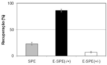 Os cartuchos de E-SPE (Figura 8) receberam em sua montagem uma tela de aço inoxidável abaixo do filtro inferior que funcionou como eletrodo. Para a aplicação do campo elétrico, um segundo eletrodo removível (eletrodo superior) composto de uma espiral de aço inoxidável foi introduzido pela abertura superior do cartucho. Com os cartuchos adaptados para aplicação de campo elétrico o procedimento de extração é executado de maneira bastante semelhante ao procedimento convencional de SPE e, para tanto, é preciso empregar um sistema propulsor de solvente como bombas peristálticas ou bombas de vácuos. Um dos grandes diferenciais dos sistemas de E-SPE para os de SPE está na necessidade de empregar uma fonte de corrente ou tensão contínua ajustável, que é conectada aos eletrodos do cartucho. Durante a extração é de fundamental importância controlar e monitorar a corrente e o potencial elétrico. Nos trabalhos de Orlando et al.110-112,116 multímetros foram usados para esse propósito como mostra a Figura 8. Aplicações em preparo de amostra Morales-Cid et al.117 em 2008 empregaram pela primeira vez o termo extração em fase sólida assistida por campo elétrico. Neste trabalho foi construído um sistema de extração em fase sólida em fluxo empregando uma minicoluna de extração com 3 mm de diâmetro interno, contendo 14 mg de sorvente a base de sílica-C18, a qual foi acoplada a um equipamento de eletroforese capilar com detecção por espectrometria de massas. Esse sistema foi avaliado na determinação de três antimicrobianos (tetraciclina, clortetraciclina e oxitetraciclina) e de quatro aminas (propilamina, 3-metil-1-butanamina, 1-metilbutilamina e heptilamina) como compostos modelo. O campo elétrico para o dispositivo de E-SPE foi gerado pela mesma fonte de tensão de separação usada no equipamento de eletroforese capilar. Usando voltagens de -10 kV o campo elétrico foi capaz de aumentar o sinal da tetraciclina em até 7,5 vezes, o que foi atribuído tanto ao efeito de empilhamento (stacking) das moléculas em um menor volume de solvente de eluição como ao formato do pico, mais estreito e com melhor simetria. Resultados semelhantes também foram obtidos para os demais analitos. Apesar de utilizarem os mecanismos eletrocromatográficos no processo de extração, neste trabalho os autores empregaram um dispositivo que configura uma coluna de SPE e não um cartucho de SPE convencional do tipo seringa. Neste trabalho também foi necessário utilizar potenciais elétricos elevados para obter os resultados desejados, o que ocasionou problemas de escape de descargas elétricas sobre a bomba peristáltica utilizada. Esse sistema foi avaliado somente para soluções padrão e não foi demonstrado seu desempenho em amostras complexas. Em um dos primeiros trabalhos110 envolvendo E-SPE foram extraídos dois corantes catiônicos e seis aniônicos em solução tampão, além de três antimicrobianos em amostras de leite. Neste trabalho, um exemplo expressivo da maior eficiência da E-SPE em relação à SPE foi observado para os resultados de testes de recuperação para o corante catiônico azul de metileno, extraído de solução tampão (Figura 9). Neste exemplo foram avaliadas duas polaridades diferentes dos eletrodos durante a aplicação do campo elétrico na etapa de limpeza. Os resultados de recuperação evidenciaram que a E-SPE poderia ser empregada tanto para favorecer a permanência do corante no cartucho quanto para auxiliar a saída de compostos carregados (analitos ou interferentes).